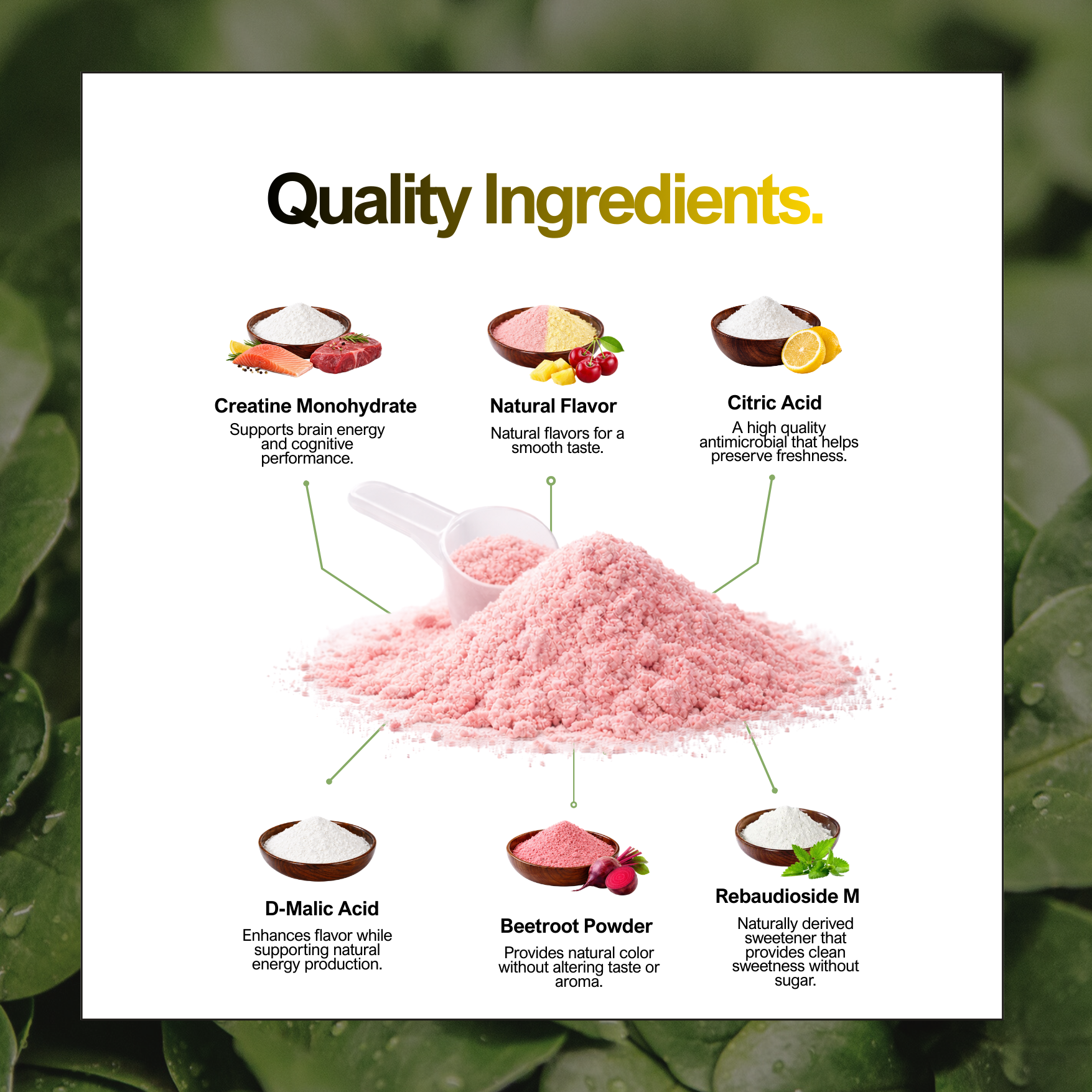Creatine Monohydrate supports brain energy and cognitive performance. Beetroot powder provides natural color and plant based nutrients. Citric acid from cassava root helps preserve freshness.